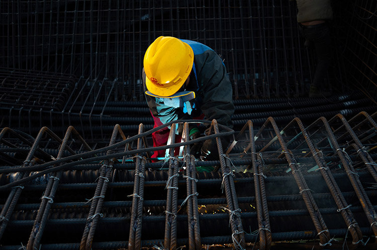 图为现场工人正在进行匝道现浇梁钢筋施工的镜头。