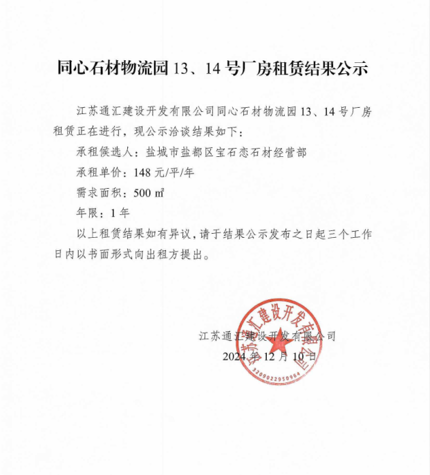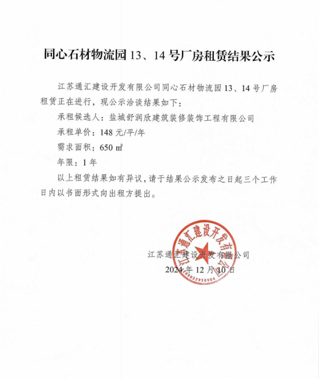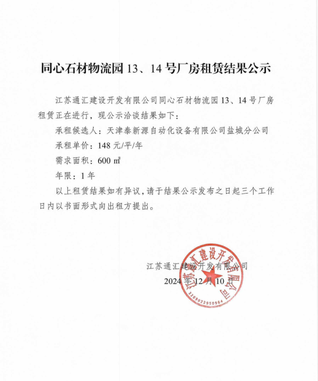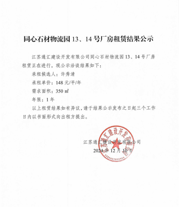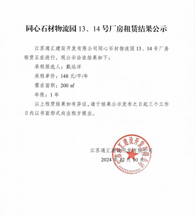 关于同心石材物流园13、14号厂房租赁结果的公示