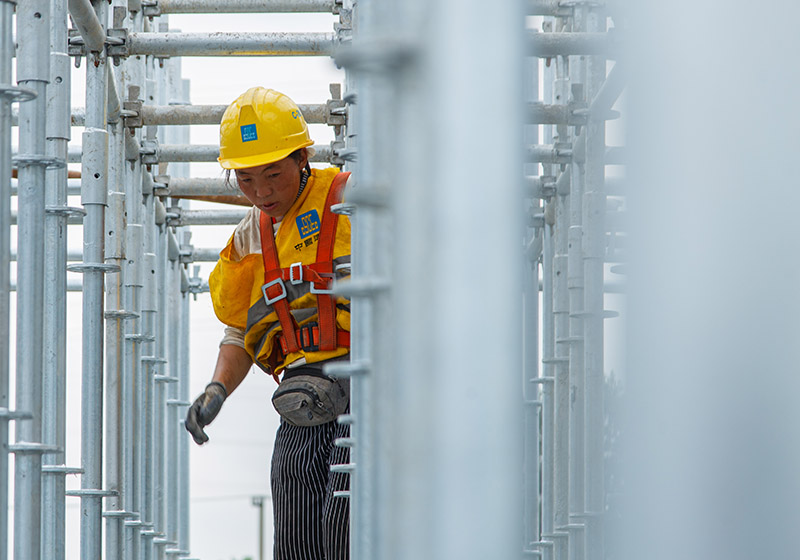 在下面传递钢管构件的丈夫,时不时用毕节家乡话关心、提醒她几句。