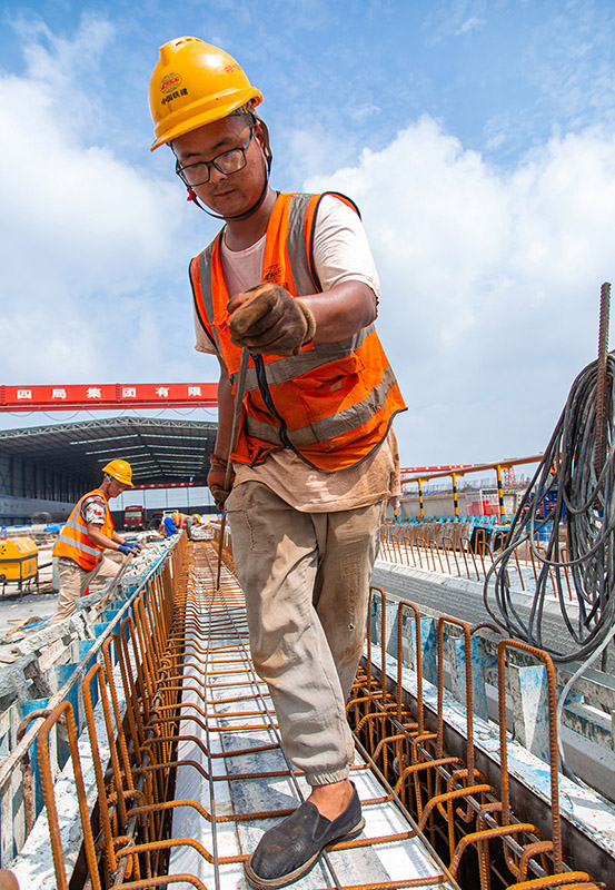 7月21日,343国道盐丰快速通道YF3标预制梁场,工人们顶着烈日,挥汗如雨进行预制箱梁施工。该快速通道连接大丰区和盐都区,全长25公里,是带动大丰区及沿线村镇深度融入主城的关键工程,建成也将是市区南翼的产业大通道。因为疫情耽误了不少时间,项目推进滞后于计划。为了追加损失的工期,盐丰快速通道项目管理办号召全线工程建设者战高温、斗酷暑,加班加点推进工程施工,题图中50岁的董行运跟弟弟一起在工地打工,脸上的汗不停滴落,说早习惯了,多喝点水就是。