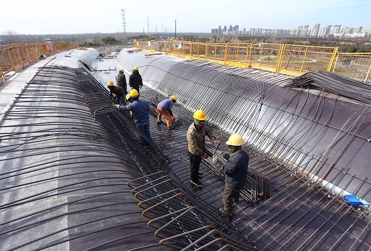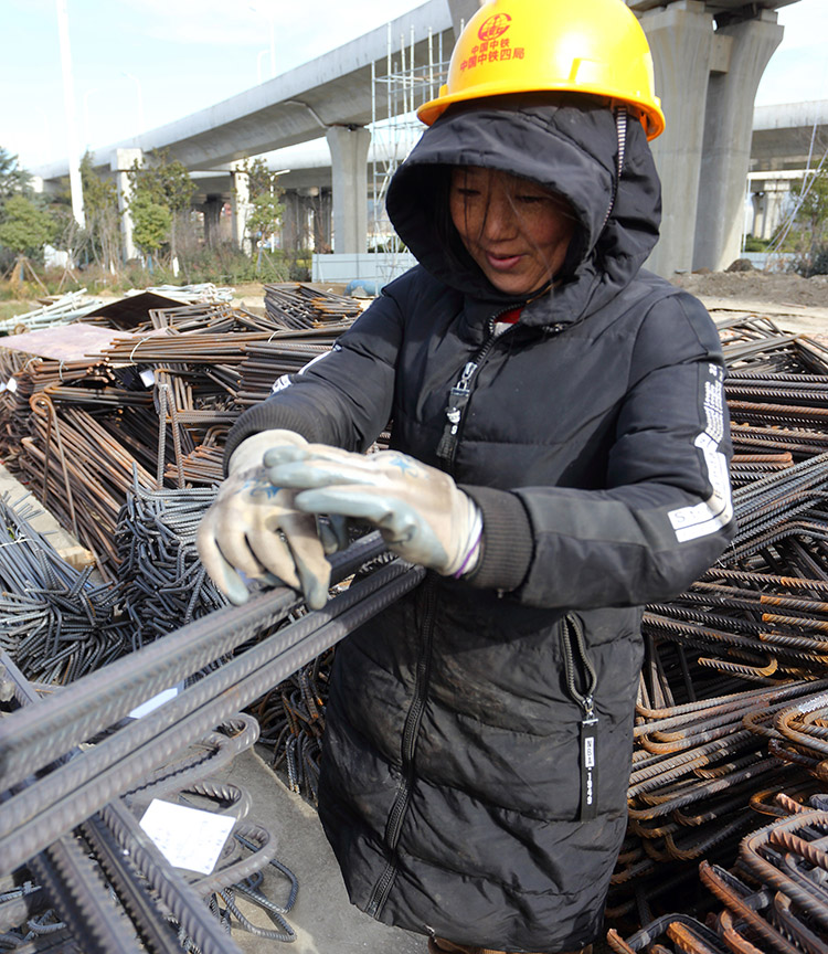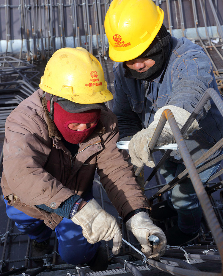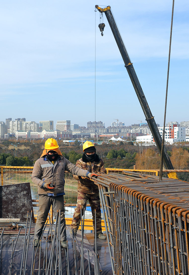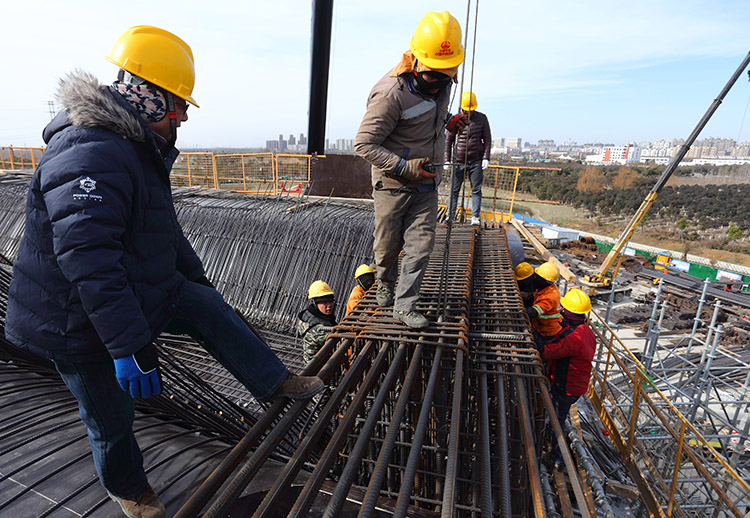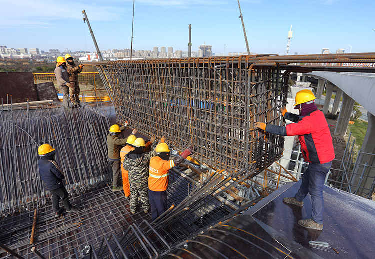 1月7日,盐城市区中午12点,室外气温仍达到摄氏零下8度,为本地区有气象记录以来所少见的极寒天气。在市区快速路网优化工程新都枢纽工地,为了确保春节前开放临时封闭的匝道桥,方便市民过节,高架工人们在加强防寒保障措施的同时,一如既往地早晨6点半钟就到上班,顶着刺骨的寒风,每天工作10个小时进行枢纽区新增匝道桥施工。