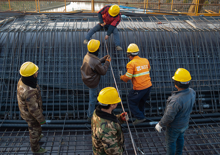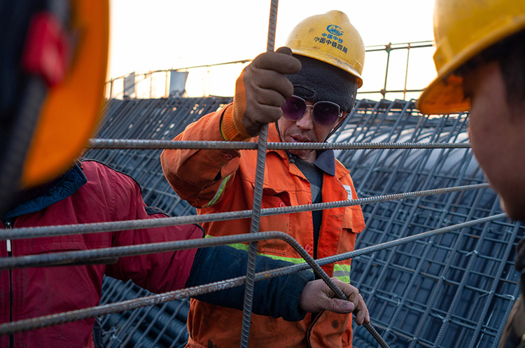 图为现场工人正在进行匝道现浇梁钢筋施工的镜头。