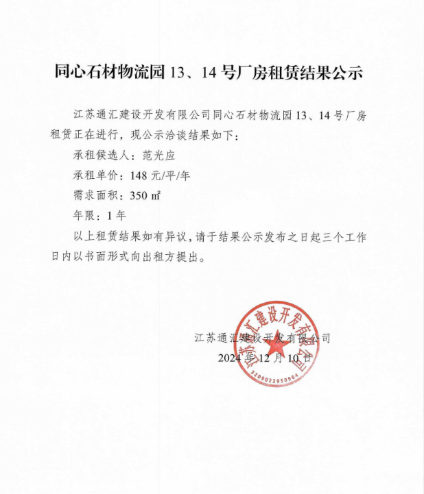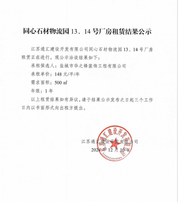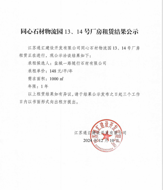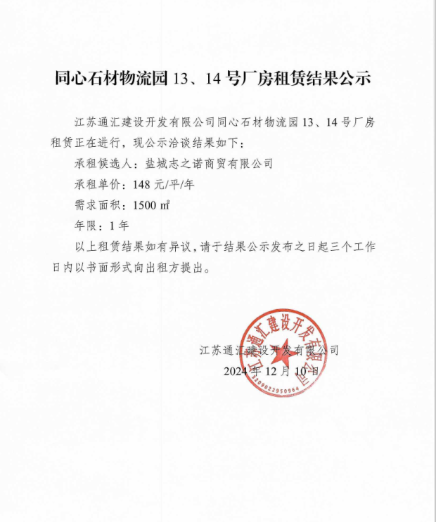 关于同心石材物流园13、14号厂房租赁结果的公示